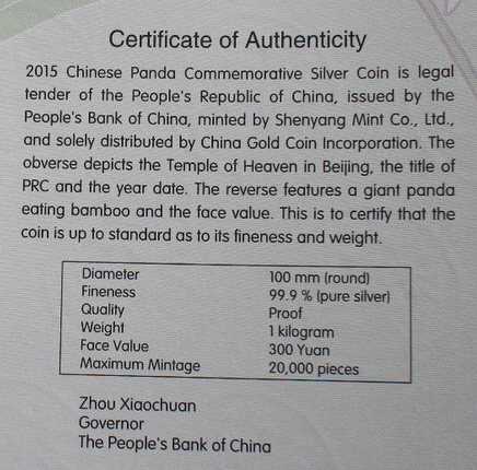 Silbermünze China Panda 1 Kg 2015 Ag. 999 PP mit Box und Zertifikat (Nr.201629436050)