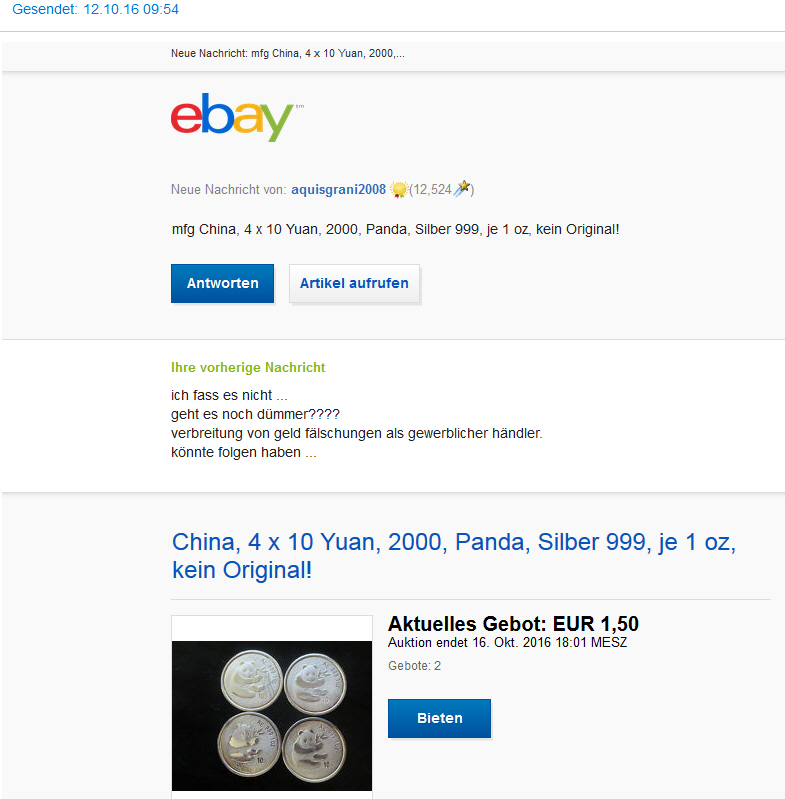 hey wg Grüße, das bezieht sich auf den von mir erfragten panda oben? na nur gut das der Verkäufer eine auktion wollte und auf mein Angebot nicht eingegangen ist. ach ja.. er kenne sich mit Münzen nicht so aus sagte er