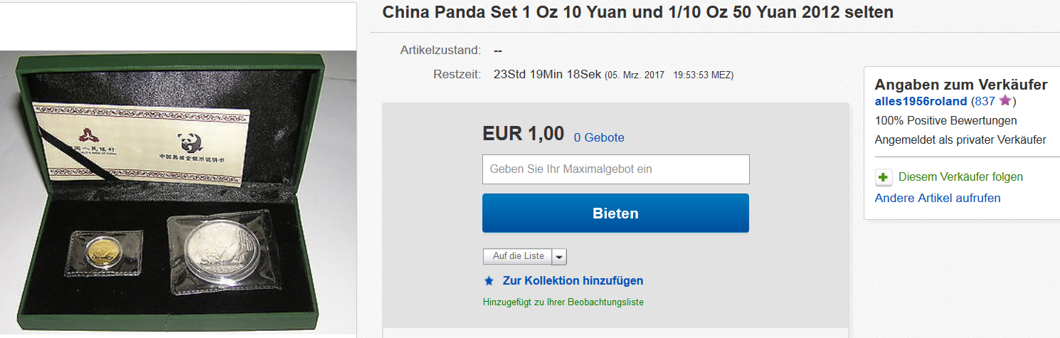 Biete aus Nachlass an: China Panda Set 1 Oz 10 Yuan und 1/10 Oz und 50 Yuan 2012 selten sehr schöner Zustand, mit Zertifikaten selten in Deutland zu bekommen, in Münzkapsel noch Eingeschweißt in Schatulle ....