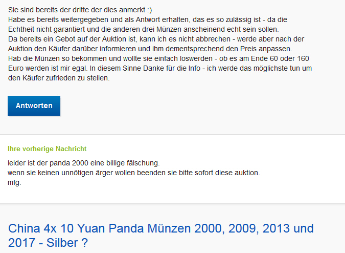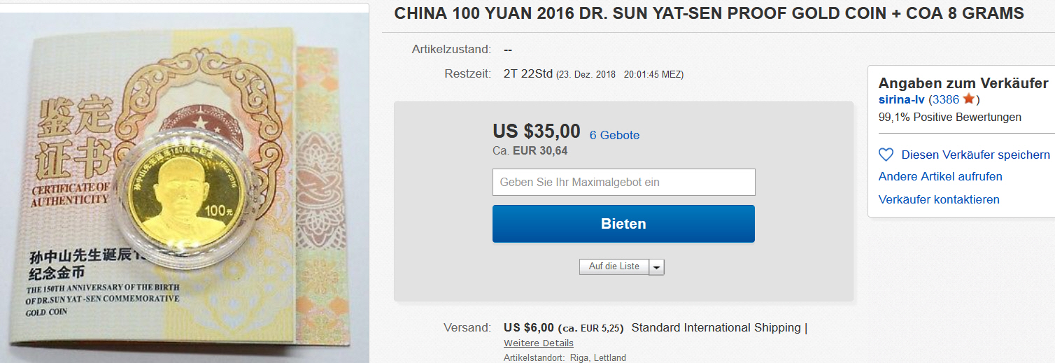 ZitatVor dem Verkauf dieser Münzen müssen Sie zuerst die folgenden Bedingungen prüfen: Finden Sie heraus, woher die Münzen kommen und lassen Sie diese, wenn nötig, prüfen. Sie dürfen keine Artikel bei eBay einstellen, deren Echtheit Sie nicht bestätigen oder nachweisen können. Lesen Sie hierzu unseren Grundsatz zum Ausschluss der Echtheitsgarantie.