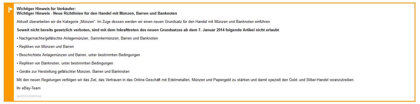 ZitatVor dem Verkauf dieser Münzen müssen Sie zuerst die folgenden Bedingungen prüfen: Finden Sie heraus, woher die Münzen kommen und lassen Sie diese, wenn nötig, prüfen. Sie dürfen keine Artikel bei eBay einstellen, deren Echtheit Sie nicht bestätigen oder nachweisen können. Lesen Sie hierzu unseren Grundsatz zum Ausschluss der Echtheitsgarantie.
