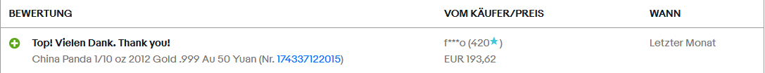 Zitat von sveni_2Hier können Sie eine nachgeahmte Münze Panda Bär 10 Yuan ...... ersteigern , sie ist eingeschweißt , ich kann nicht sagen aus was für ein Material diese Münze ist , sie ist nicht aus Silber , sie ist herausgegeben von der Peoole`s Bank of China..
