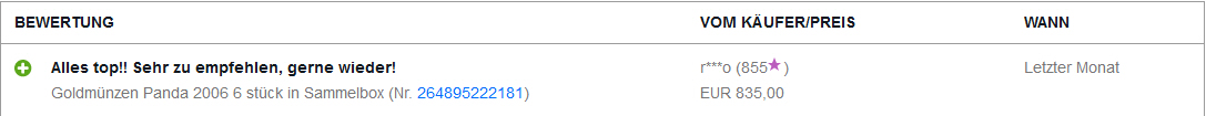 Zitat von sveni_2Hier können Sie eine nachgeahmte Münze Panda Bär 10 Yuan ...... ersteigern , sie ist eingeschweißt , ich kann nicht sagen aus was für ein Material diese Münze ist , sie ist nicht aus Silber , sie ist herausgegeben von der Peoole`s Bank of China..