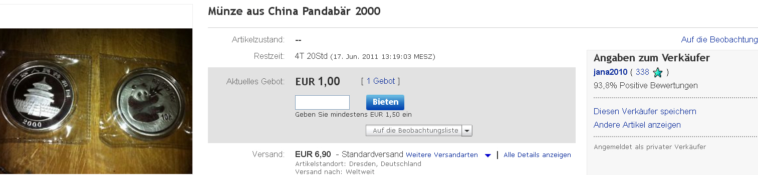 der Verkäufer Jana verkauft fleißig ihre Fakes weiter trotz rote Karte und Meldung bei Ebay. Ich wurde leider gesperrt von Ihr.http://cgi.ebay.de/Munze-China…illen&hash=item19c6441cb9