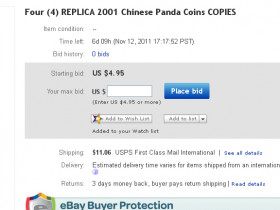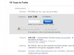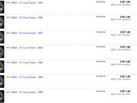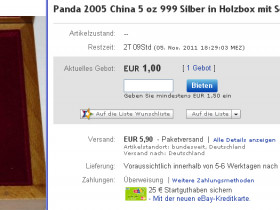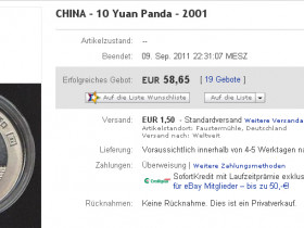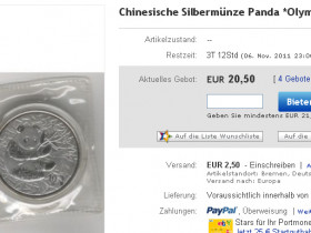 ctgchina ( 2461[Blockierte Grafik: http://p.ebaystatic.com/aw/pics/icon/iconRedStar_25x25.gif]) 04.11.11 13:36 CHINA - 10 Yuan Panda - 1999 (Nr.290606054264)EUR 111,00Also erstmal danke für deine Aufklärungsarbeit. ABER in diesem Beispiel ist der Käufer doch absolut selber Schuld, zumal er kein Laie zu sein scheint. Da frißt mal wieder Gier Hirn. So was kauft man einfach nicht, oder zumindest nicht für den Preis. Steht groß da: Silber oder versilbert .... weiß ich nicht ....