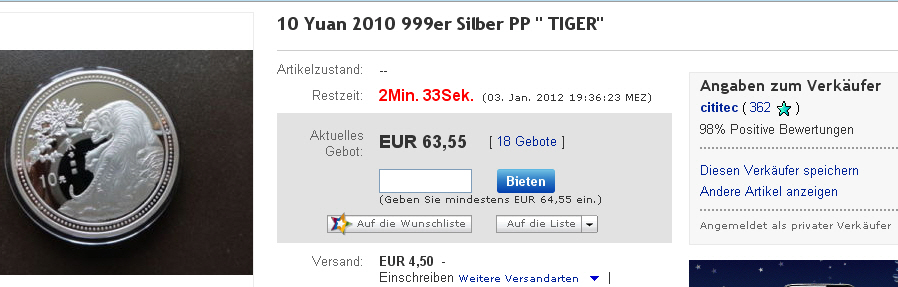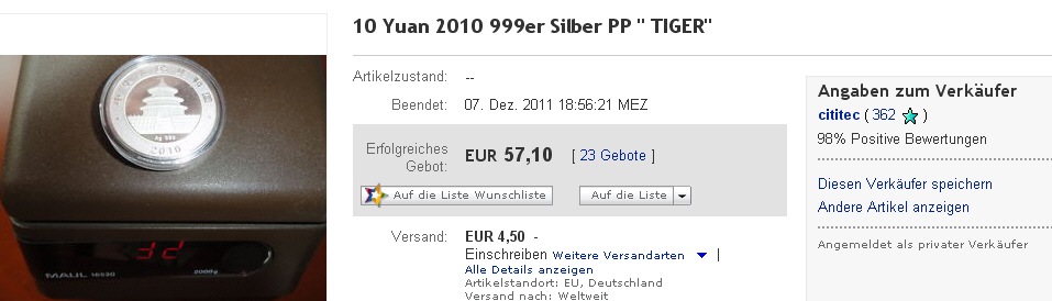 Mitgliedsname aviator9990 ( Bewertungspunktestand von 904[Blockierte Grafik: http://q.ebaystatic.com/aw/pics/icon/iconPurpleStar_25x25.gif]) 15.12.11 14:34 10 Yuan 2010 999er Silber PP " TIGER" (Nr.330650851917)EUR 57,10Artikel aufrufenwg
