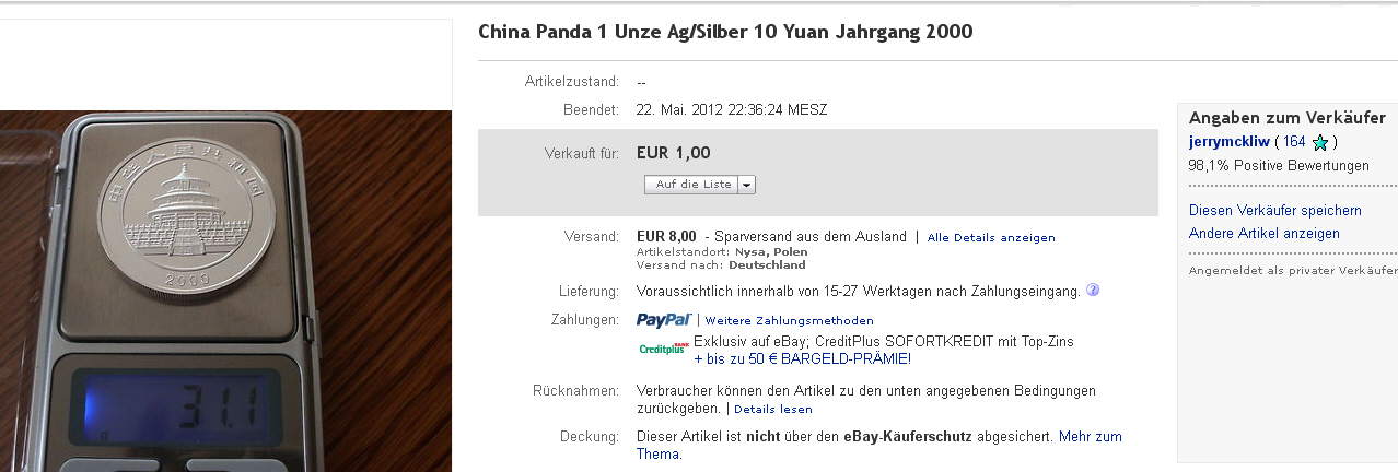 Mitgliedsname schluesseldienst2011 ( Bewertungspunktestand von 217[Blockierte Grafik: http://q.ebaystatic.com/aw/pics/icon/iconTealStar_25x25.gif]) 27.05.12 01:19 Münze 10 Yuan 2000 China Panda Nachprägung? (Nr.120913235237)EUR 111,55Artikel aufrufen
