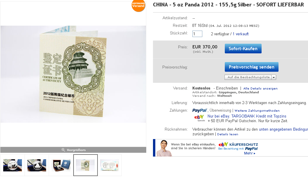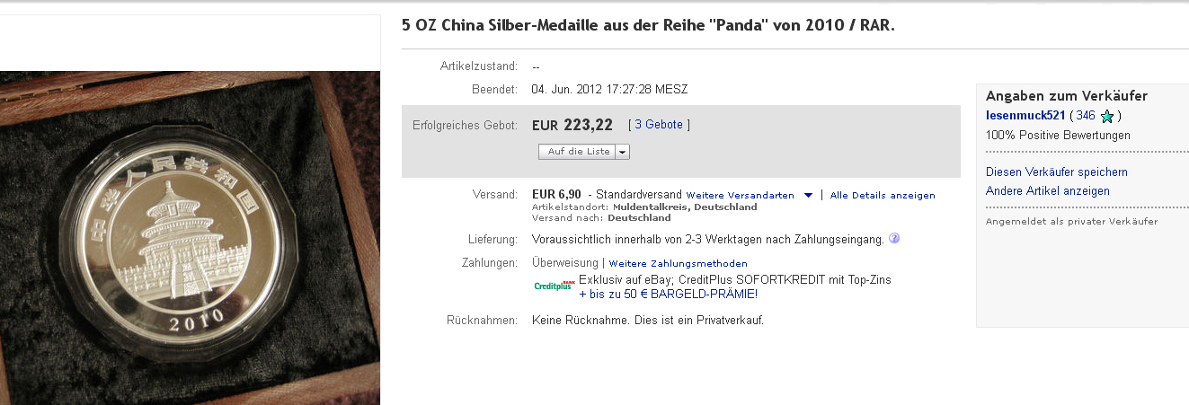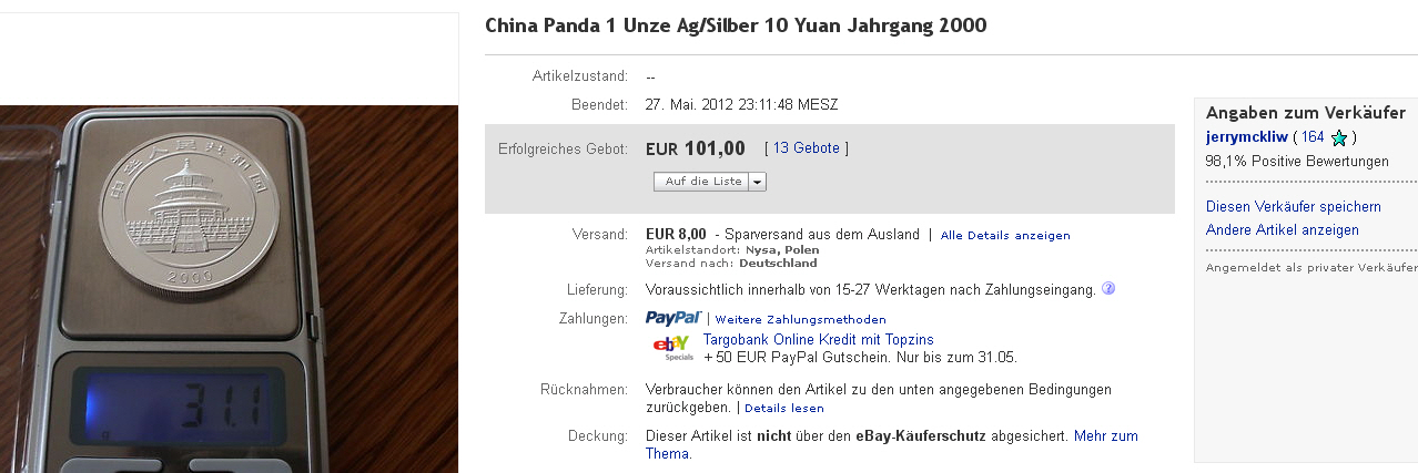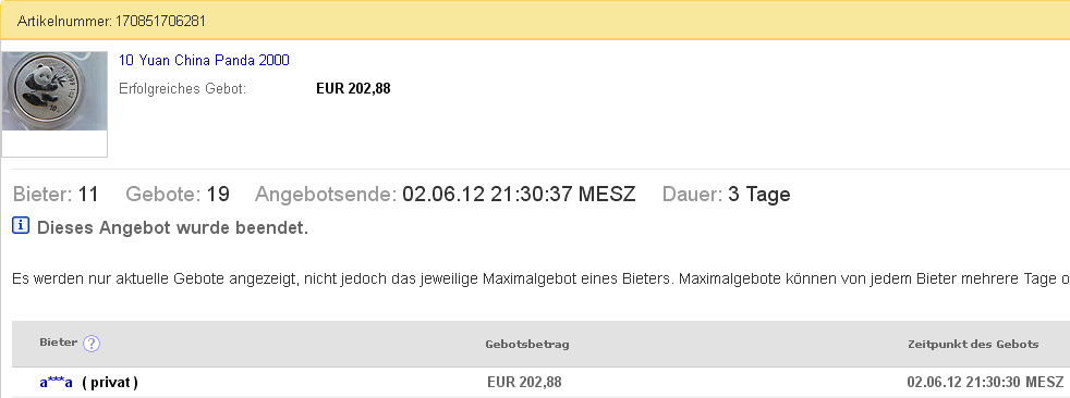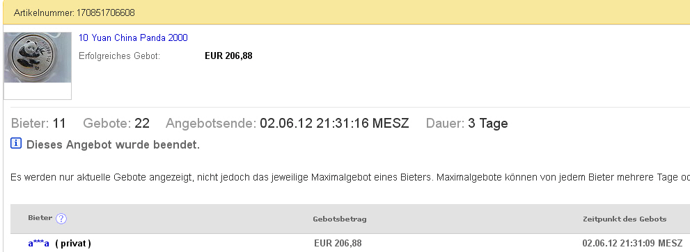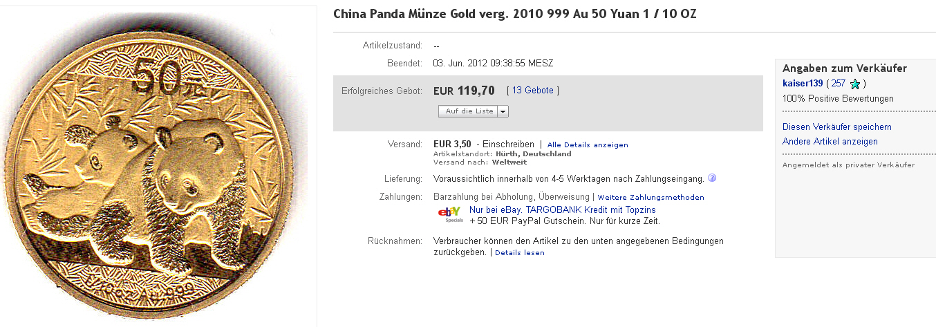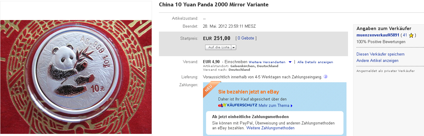 Mitgliedsname schluesseldienst2011 ( Bewertungspunktestand von 217[Blockierte Grafik: http://q.ebaystatic.com/aw/pics/icon/iconTealStar_25x25.gif]) 27.05.12 01:19 Münze 10 Yuan 2000 China Panda Nachprägung? (Nr.120913235237)EUR 111,55Artikel aufrufen