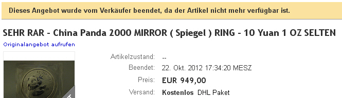 Mitgliedsname javafisch (privat) 10.06.12 09:11 10 Yuan China Panda 2000 (Nr.170851706281)EUR 202,88