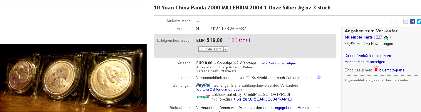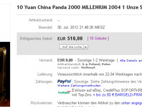 Mitgliedsname javafisch (privat) 10.06.12 09:11 10 Yuan China Panda 2000 (Nr.170851706608)EUR 206,88