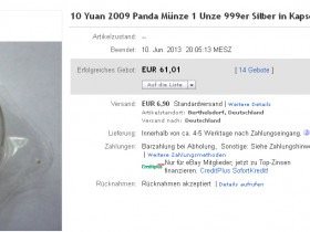 Mitgliedsname spiegelglanz ( Bewertungspunktestand von 44[Blockierte Grafik: http://p.ebaystatic.com/aw/pics/icon/iconYellowStar_25x25.gif]) 28.06.13 01:01 China Panda 2000 10 Yuan 1 Unze 999er Silber in original Kapsel eingeschweißt! (Nr.140998314667)EUR 300,00Artikel aufrufen -