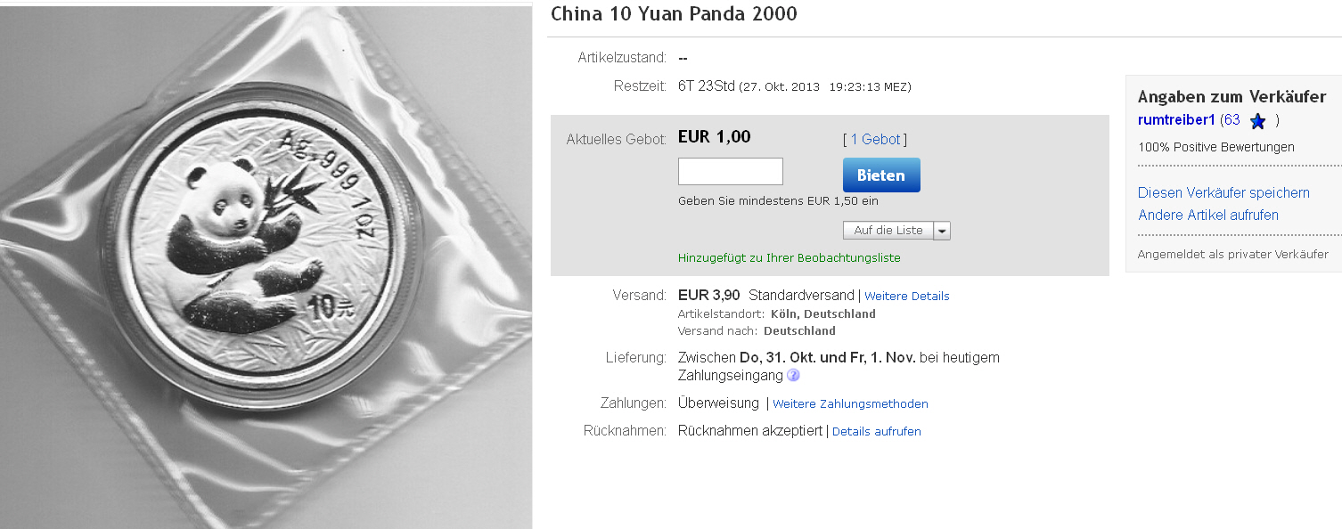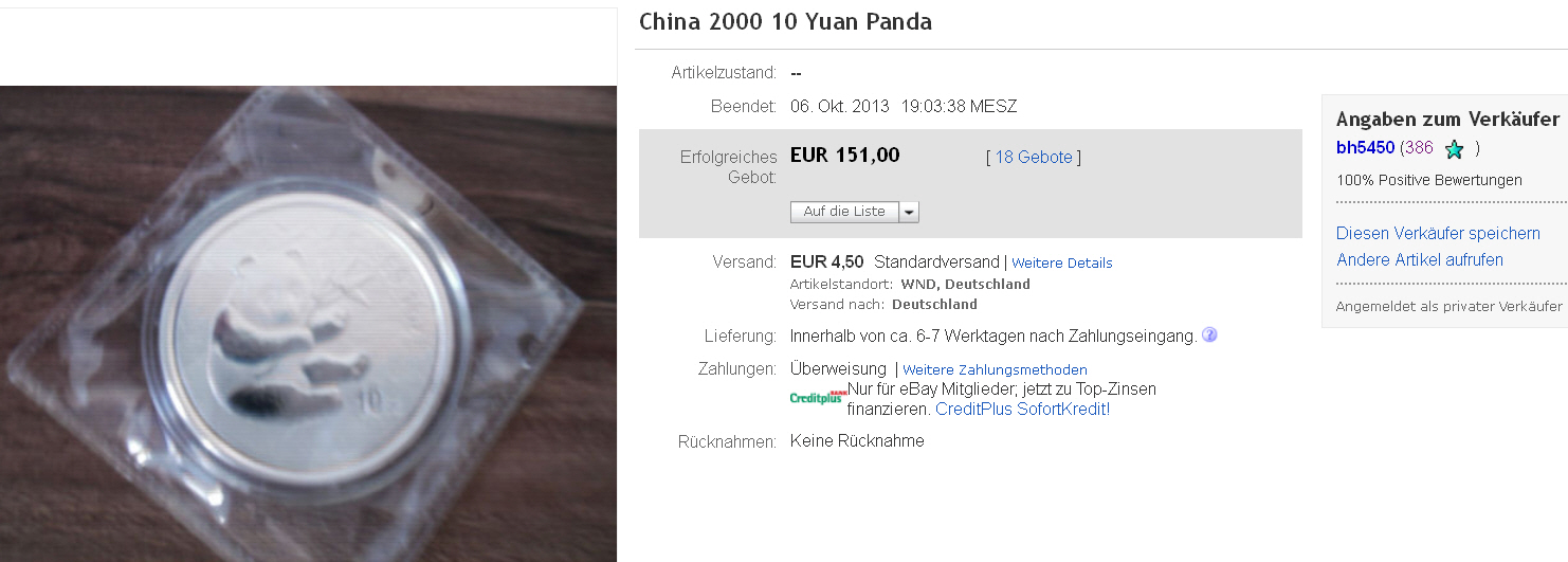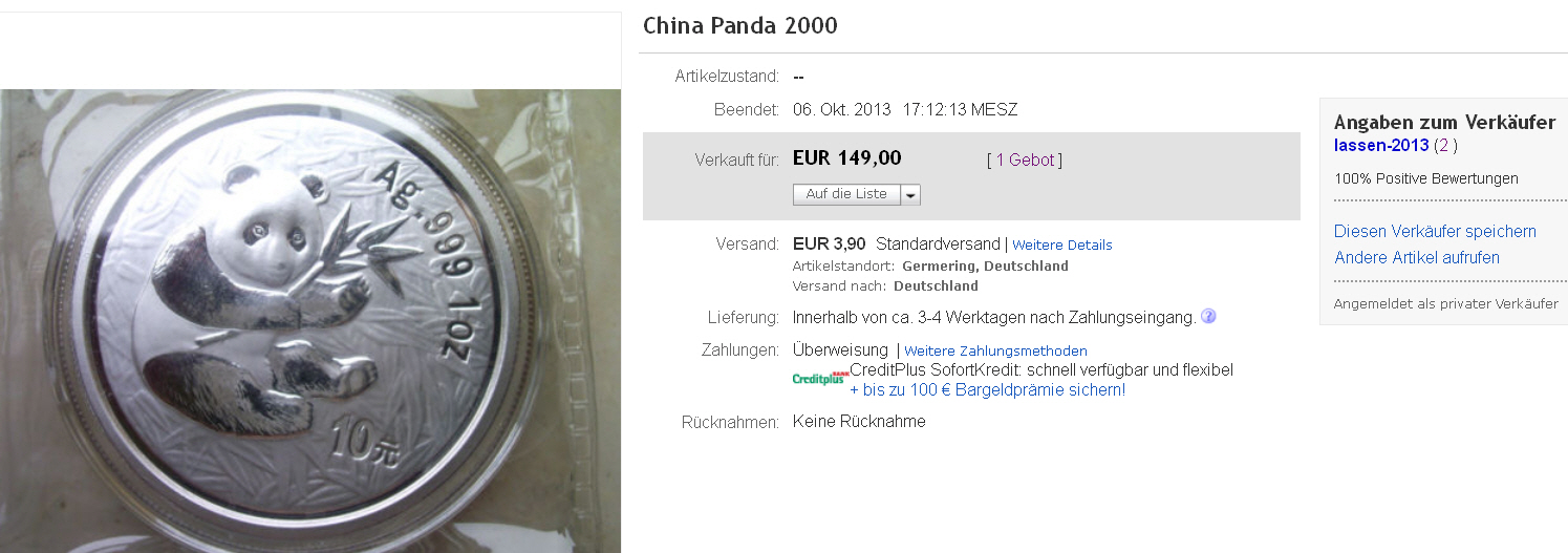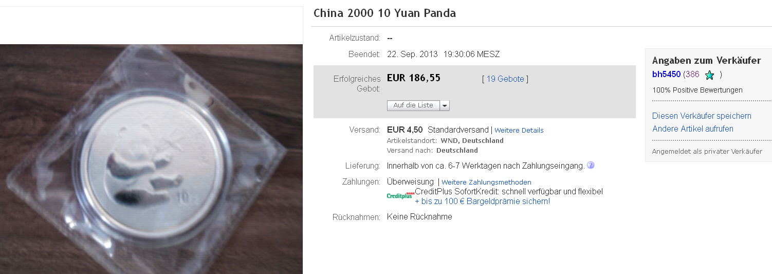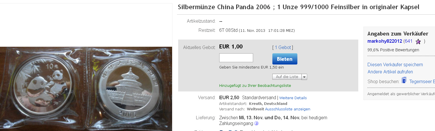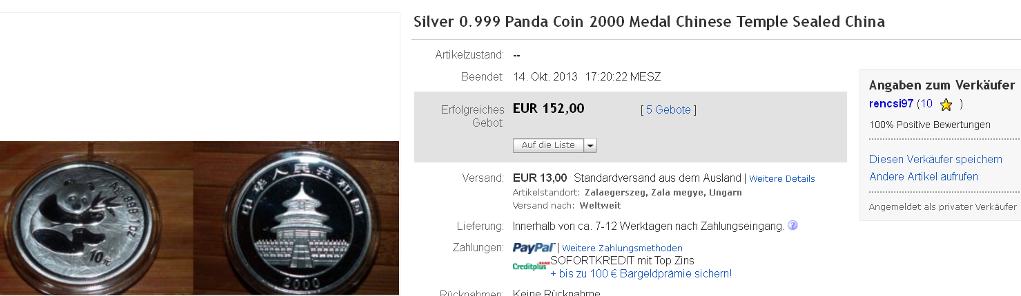 Die Münze ist aus echtem Silber und ich habe diese von einem seriösen Ebay-Verkäufer für 190 € gekauft.