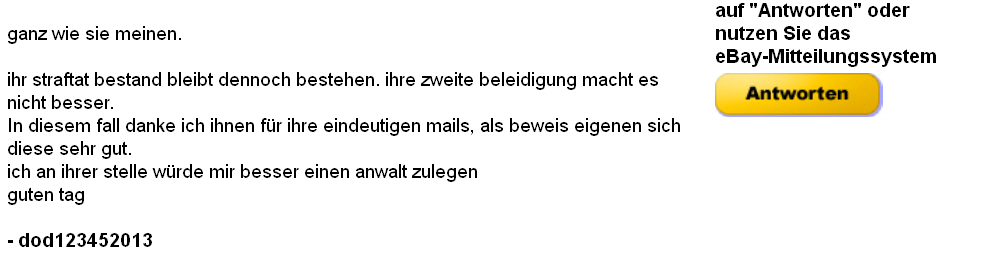 nach ihrer ersten mail erfüllten sie nur den straftat bestand der beleidung,