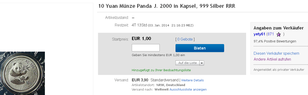 Zum Thema China Fakes kann ich mich nur wundern warum die Panda Käufer auf eBay sich nicht die Frage stellen warum seltene Münzen ( insbesondere der 2000 er) so häufig angeboten werden. Mehr an Erkenntnis braucht es eigentlich nicht um nicht für viel Geld von unbekannten Verkäufern Münzen zu kaufen.