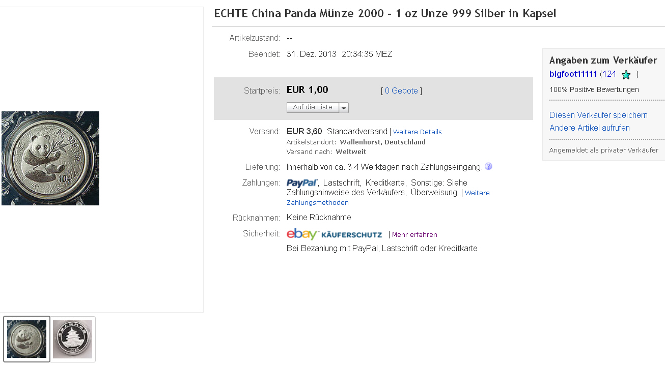 Aber zurück zu den Fakes: Ich persönlich muss feststellen, dass ich mich an den letzten ECHTEN 2000er 1oz Silver Panda mirrored bei ebay.de nicht mehr erinnern kann. Ich stelle mal hier die provokante Frage: Kann sich jemand an einen echten Mirror erinnern ? ![]()