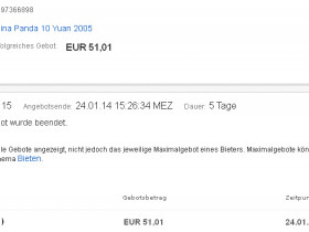 Am 29.01.14 hat der Verkäufer die folgenden Angaben hinzugefügt:da ich x Anfragen und Hinweise bekommen habe das diese Münze eine Fälschung ist nehme ich sie aus der Versteigerung.Diese Sammler wissen wohl nicht das es mindestens 3 Varianten gibt und diese sehr Selten.Ich werde dafür einen Panda mit matten Ring einstellen,dieser hat leider eine kleine patina oben rechts