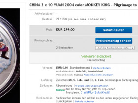 Am 29.01.14 hat der Verkäufer die folgenden Angaben hinzugefügt:da ich x Anfragen und Hinweise bekommen habe das diese Münze eine Fälschung ist nehme ich sie aus der Versteigerung.Diese Sammler wissen wohl nicht das es mindestens 3 Varianten gibt und diese sehr Selten.Ich werde dafür einen Panda mit matten Ring einstellen,dieser hat leider eine kleine patina oben rechts