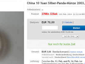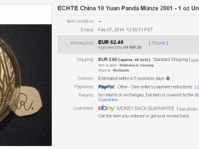 Zu Ihrer Frage: Die Pandamünze auf die Sie sich beziehen und die ich aktuell über Ebay anbiete ist über jeden Zweifel erhaben, da sie absolut Original ist. Ich bin selbst Pandamünzensammler und achte hierbei sehr auf Qualität und Originalität, etwas Anderes kommt für mich selbstverständlich nicht in Frage. Lieber etwas mehr Geld hierfür ausgeben, als auf eine Fälschung hereinfallen. Das war und ist mein Sammlerprinzip.