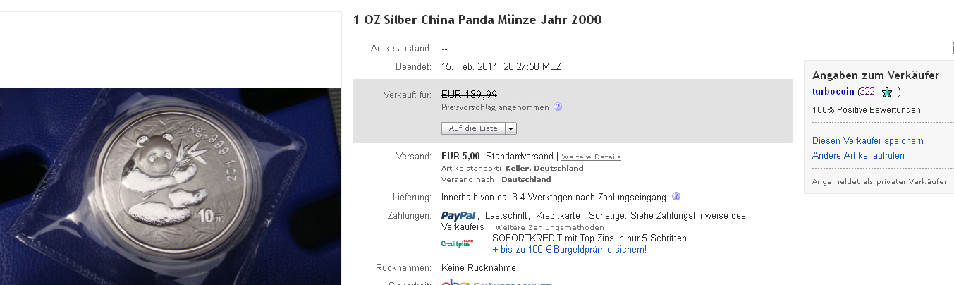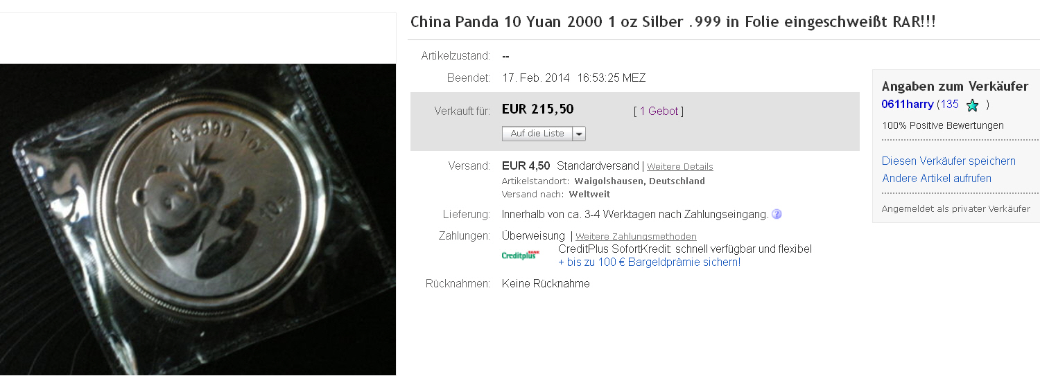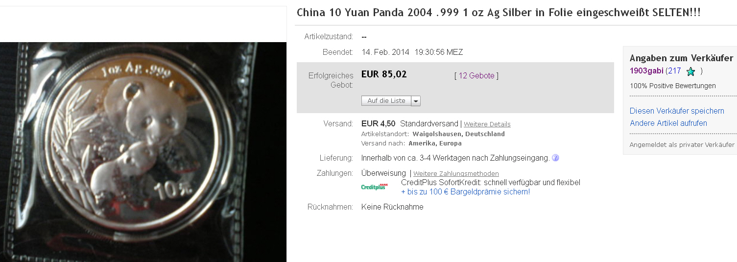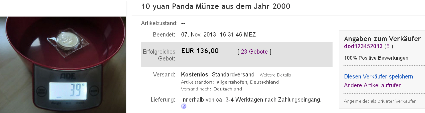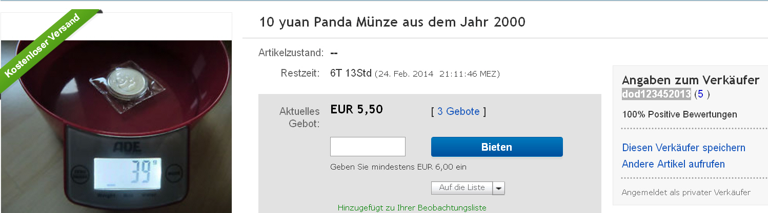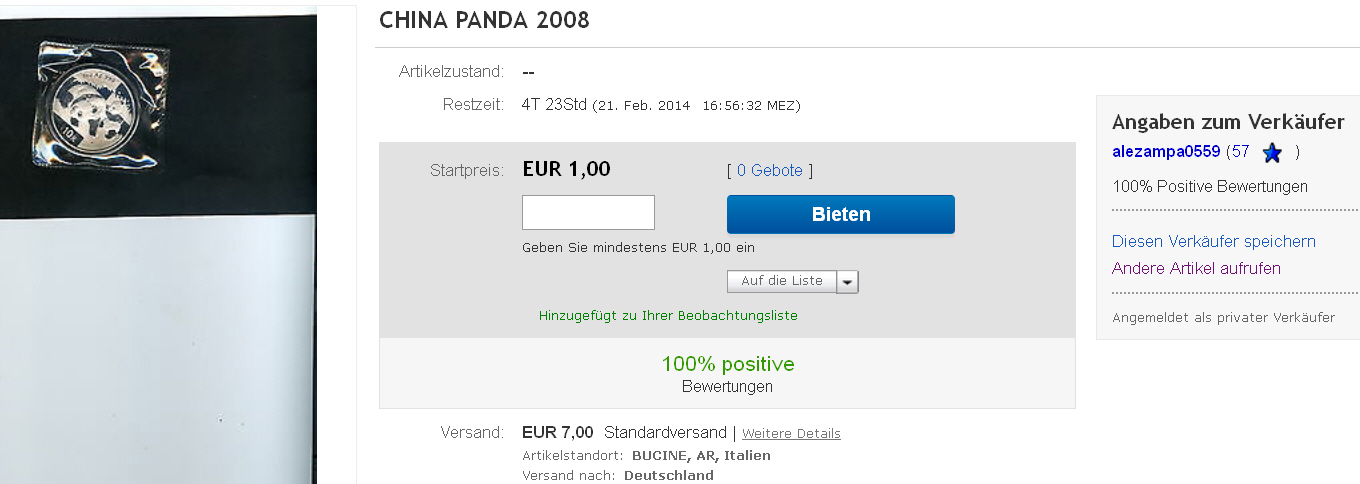ich bins nochmal. Ich war heute beim Münzhändlerund habe ihn den Panda gezeigt, aber der hat nichts falsches entdecken können. Die Fahrt hätte ich mir sparen können. Bei Ebay wurde ein Fall geöffnet,der Verkäufer gibt anstandslos das Geld zurück, ich soll die Münze zurückschicken!