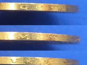 - da kann ich eigentlich nur eins sagen: hier passt gar nichts! Die Randschrift wirkt wie von "Kindern geschrieben". Der "Abschlepphaken" beim G fehlt, kein Punkt im O, von den Ts will ich erst gar nicht reden, M, N und U sind nicht einmal vollständig "geschrieben"... lausig.