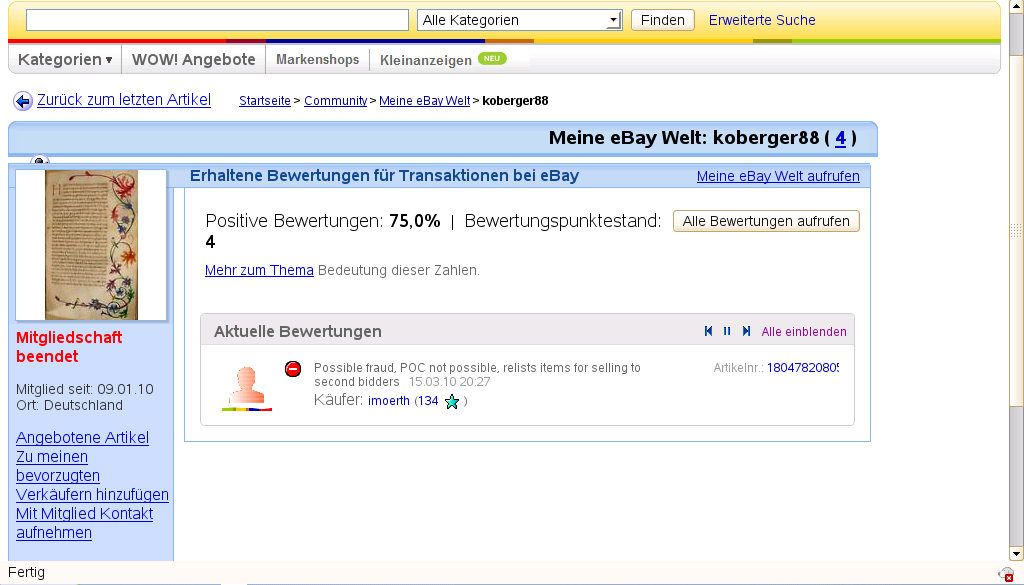 • Ich habe über 500 Transaktionen bei Ebay durchgeführt und bin noch nie betrogen worden, deshalb kann mein Vorgehen so dumm auch nicht sein. Auch von koberger wäre ich wohl nicht betrogen worden, schließlich hat er eine Eigentums- und Identitätsprüfung von Ebay überstanden, wurde auch nach den ganzen Verleumdungen von Ebay nicht gesperrt, ist inzwischen verifiziertes Mitglied und hat auch bezüglich der Goldverkäufe positive Bewertungen bekommen.