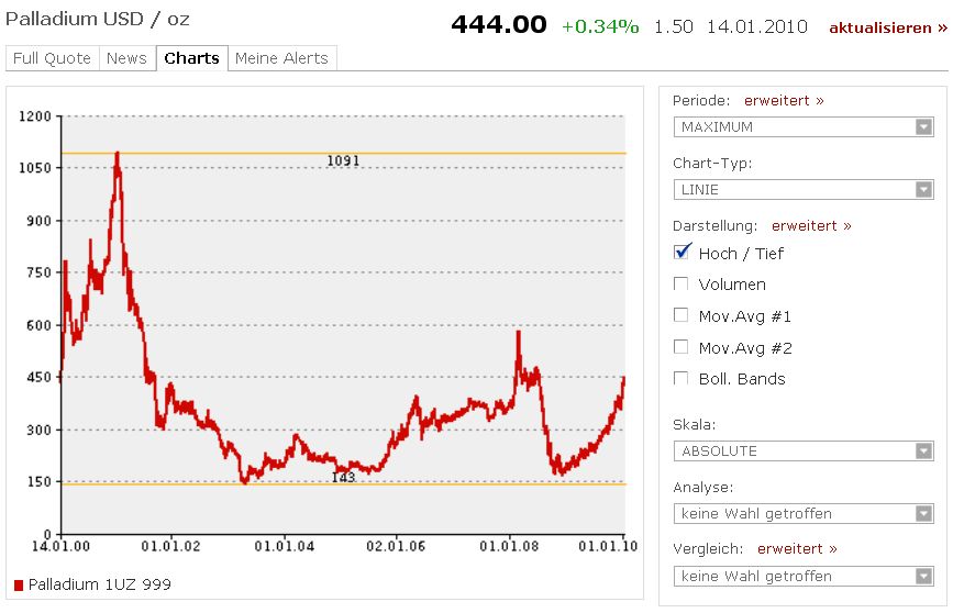 Nimmt man aber den gemäßigten Aufwärtstrend von 2003-2007 und verlängert man ihn einfach ohne Rücksicht auf die Ausschläge in 2008, dann käme man jetzt in den Bereich von 380 EUR oder 600 Dollar. Es sieht so aus, als ob Pd auf diese Linie zurückwill, Dann wird man sehen.