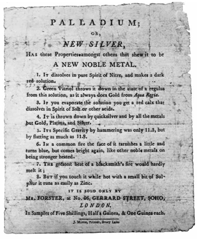 Im Anhang mal die Bildschirmkopie dieses Verkaufs- oder "Werbehandzettels" für Palladium als "New Silver" von April 1803.