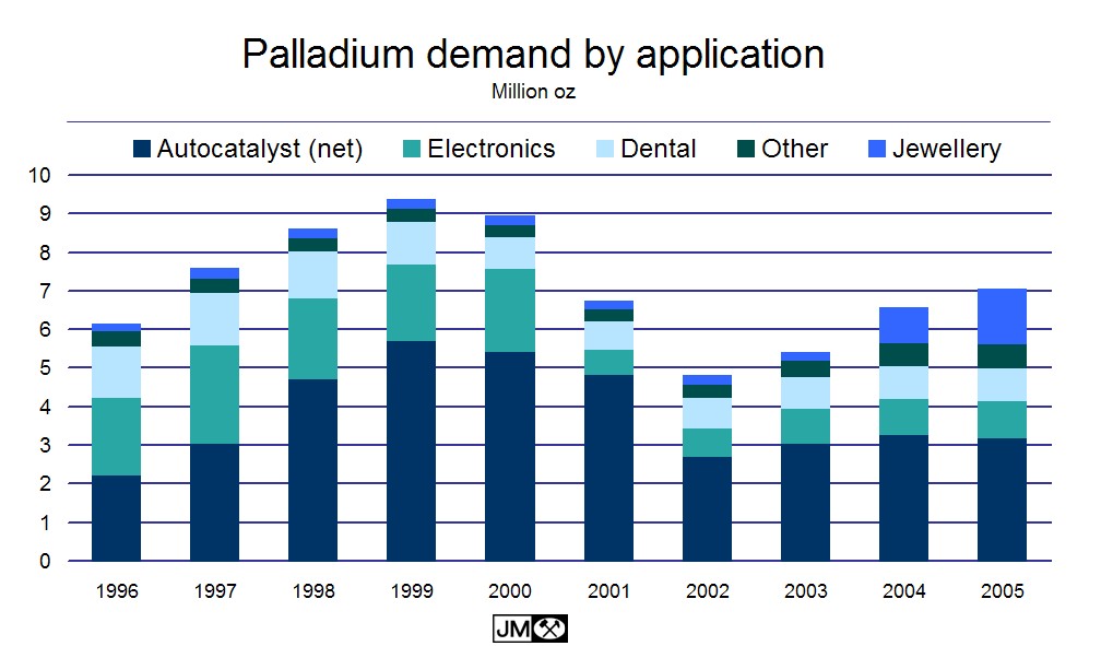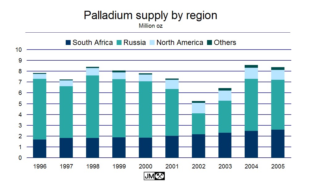 248 Tonnen Produktion Palladium in 2005 laut Platinum Matthey, bei einer Produktion von Gold in 2005 von 2450 Tonnen und Silber in 2005 von 20300 Tonnen.