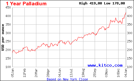 Die Palladiumpreisentwicklung kann man ziemlich schlecht vorrausberechnen, da es ja nur zu ~ 3 % in Barren/Münzen gegossen und geprägt wird. Der Rest geht an die Industrie.