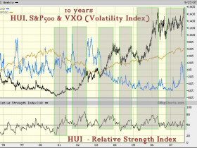 Bisher war es so, in dieser Edelmetall Hausse, dass viele der ausgeprägten Aufwärtsbeine des HUI mit sinkender und / oder vergleichsweise niedriger Volatilität am klassischen Aktienmarkt einhergingen.