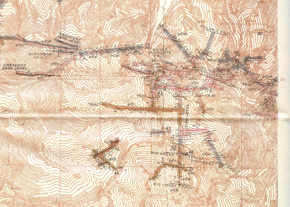 Und dazu mal noch eine Karte aus dem USGS Professional Paper 478 von 1965, sie bildet die schematisierten Faults und Teile der historischen Gangsysteme in Vogelperspektive ab. (Das Gangsystem auf dieser Karte links ist übrigens die Crescent Mine der CA:SNS !