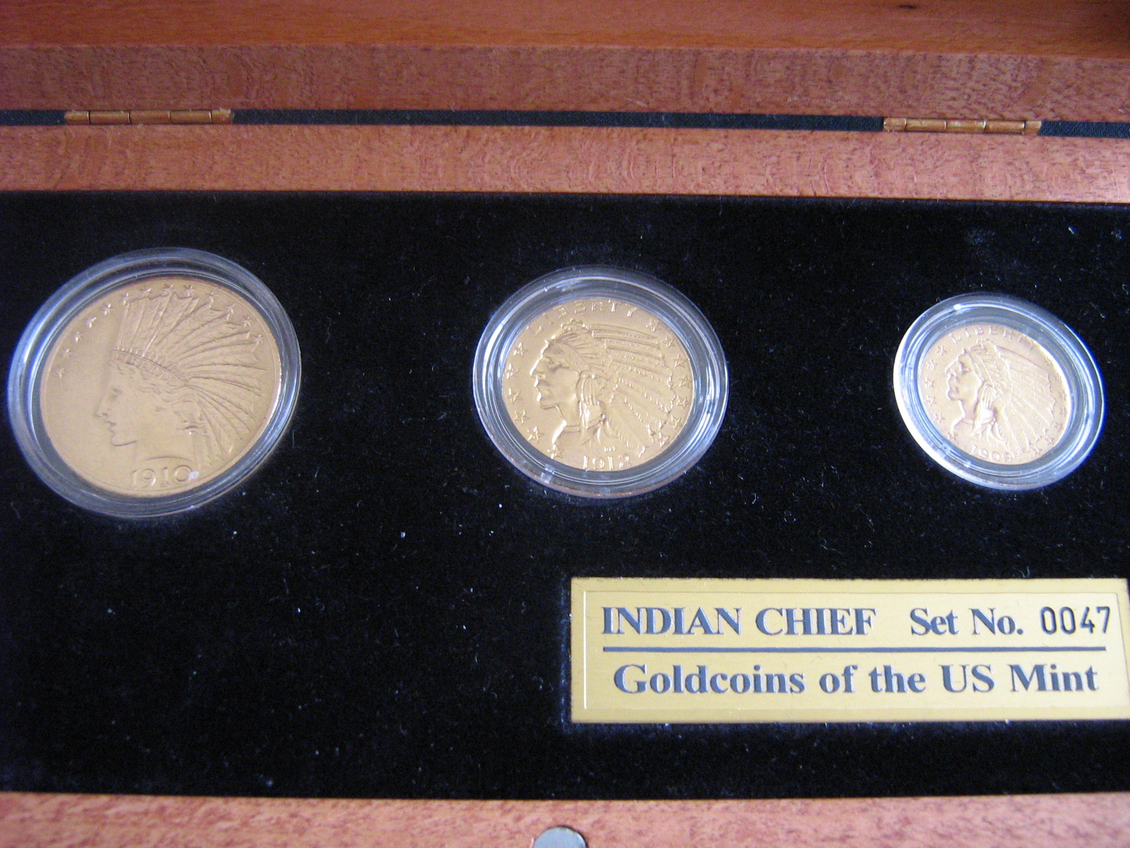 Das Set mit echten, historischen 10, 5 und 2 1/2 Dollar Goldmünzen (keine Nachprägungen), Zertifikat der US Mint in einer gefälligen Holzschatulle mit Magneverschluß und Ledertasche wurde vor 3 Jahren in einer Auflage von 1000 von MDM für 1.595,- € und zuletzt am 12.10.2008 für 1.790,- € angeboten.