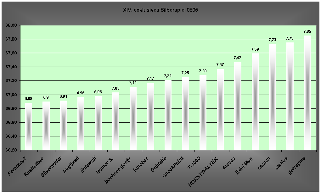 in Anbetracht Deines Engagements für das Silberspiel habe zumindest ich Verständnis für Deine verspätete Schätzung - so gebe er sie bitte noch fix ab und halte sich nicht sklavisch an das Regelwerk. Deine Einstellung ehrt Dich zwar, aber können die Teilnehmer hier vielleicht mal beide Augen zudrücken? ![]()