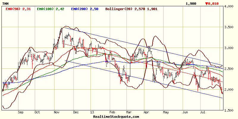 TMM hat einen Abwärtstrend ausgebildet, wie die meisten MInen auch, und nun auch das JT unterschritten, ist nicht so gut. Für meinen Teil warte ich mit evtll. Rückkauf, bis ein Aufwärtstrend erkennbar wird, schwierig genug bei den heftigen Kursausschlägen...