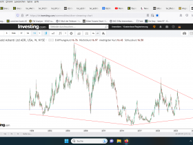 "Jetzt geht es zwar nicht um eine ähnliche oder vergleichbare Gegenbewegung, aber AngloGold Ashanti sieht zumindest danach aus, als wenn es ab jetzt für mehrere Wochen wieder korrektiv abwärts gehen könnte. Als Kursziel bietet sich die grüne Unterstützungslinie um ca. 12 USD an, die sich durch das Zwischenhoch aus dem Januar 2018 herleitet. Ab dort könnte es dann erneut für viele Wochen dem noch immer aktiven Kursziel zwischen ca. 19,53 und 22,91 USD entgegengehen"
