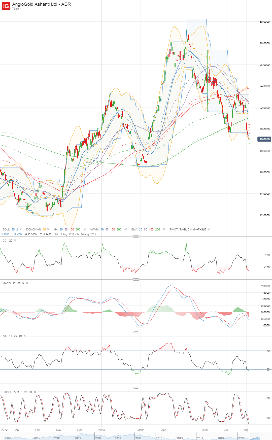 Meine Nase sagt mir (liegt leider nicht immer richtig): "die" wollen das noch unbedingt dieses Jahr sehen, Hebeler ausknocken, Stops abfischen. Dritter Schwung nach unten, Zieltiefe unbekannt: Schau den RSI und CCI im Daily - wir sind erst am Anfang. Heut vormittag schonmal fast die 18 erreicht... "die" wollen das, "die" können das