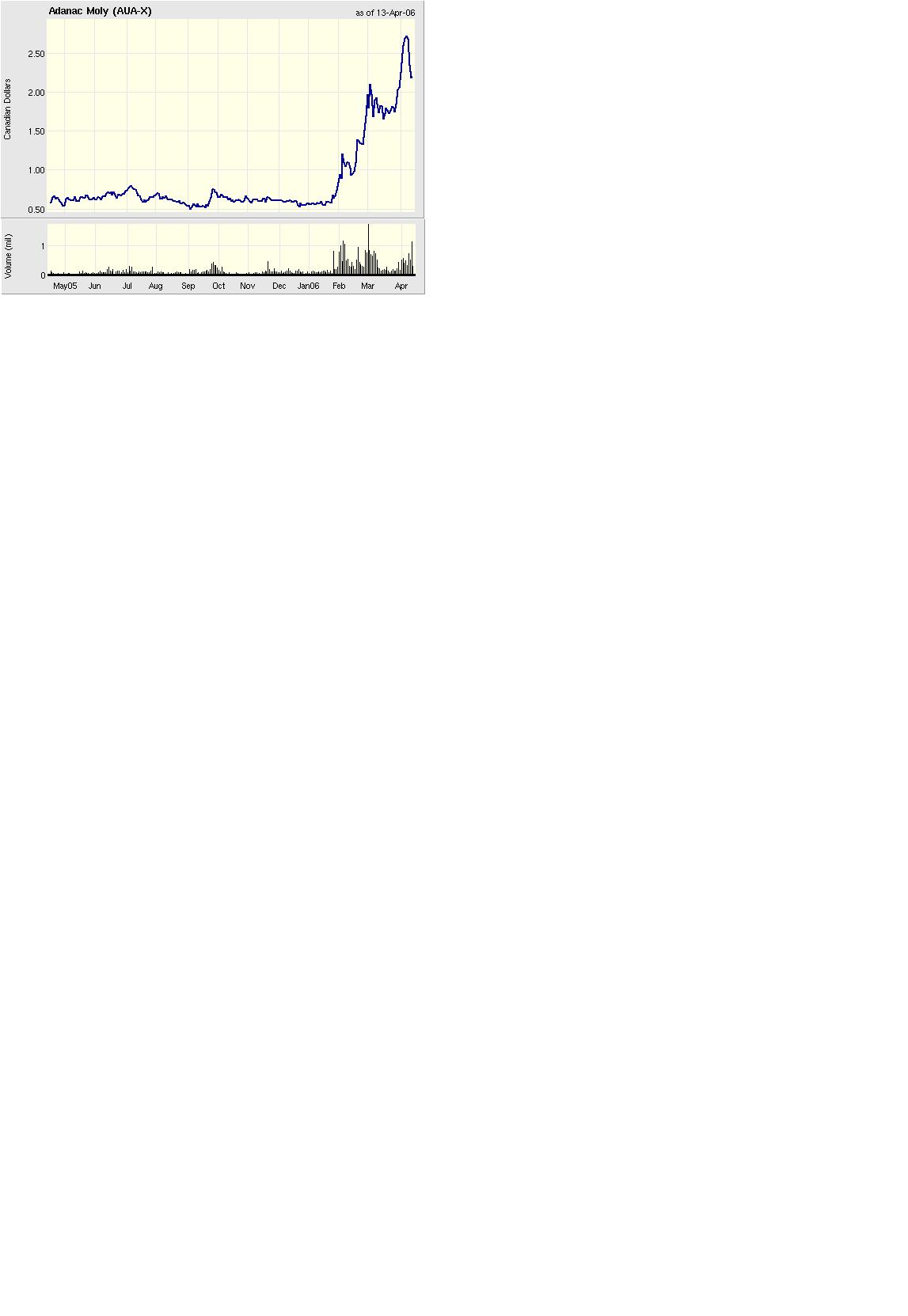 Adanac completed a flurry of financings during December 2004 that raised several million dollars. On December 21 Adanac received approval for a short offering financing of 2.4 million units at $0.50 by Canaccord. Once this financing is done Adanac will have about 50.1 million shares fully diluted. The company has 5.8 million private placement warrants outstanding that escalate from $0.40 to $0.50 on July 7, 2005. During August 2004 Adanac acquired the Nevada BC project in Nevada on reasonable terms. The Nevada BC property covers part of a tabular molybdenite bearing body controlled by US Smelting and Refining. Should Adanac secure a reasonable option on the USS claims the Nevada BC project could also become a significant moly play. This project in Nevada somewhat offsets the risk associated with the upcoming May 2005 provincial government elections in British Columbia. If the anti-development New Democrat Party comes back into power exploration and mine development in British Columbia will likely once again hit a wall of resistance that would kill the market's appetite for plays such as Ruby Creek. At the moment it does not look like the NDP will replace the incumbent Liberals (not the same as US Democrats), but BC politics is such that nothing can be taken for granted. Adanac has an advantage over other moly juniors in that the company has established a high profile as a molybdenum exploration junior. The company's web site, http://www.adanacmoly.com, provides links to current molybdenum prices and charts.