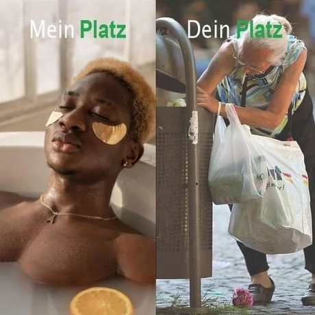 Nachmittags beobachtete ich einen jungen Flüchtling der am Geldautomaten sich Kohle holte und sich dann zum Italiener setzte. Daran vorbei leifen 2 müde, verschwitzte Müllwerker vom Feierabend kommend neben ihren Frauen die ebenfalls schon leicht gekrümmt bzw. eine hatte Gelenk oder Fußprobleme.