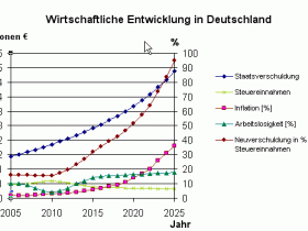 • Ich möchte einmal dazu aufrufen, dass Ihr Eure Szenarien für die Wirtschaftentwicklung der nächsten zwanzig Jahre skizziert. Am besten wäre es Diagramme anzuhängen, in denen Staasverschuldung (!)Inflation, Zinssatz, Steuereinnahmen, Arbeitslosigkeit etc. dargestellt sind.
