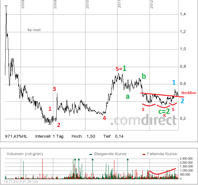 trotz so mancher Tiefschläge in diesem und letzten Jahr bei einer meiner "Lieblingsakazien" hab ich die Gelegenheit beim Schopfe benutzt und mir anhand der inversen (multiplen!) S-K-S, unterstützt durch eine sehr gut zählbare Elliott-Wellenstruktur, ein entsprechendes Depot aufgebaut und den Pullback der letzten Tage zu weiteren Käufen genützt.