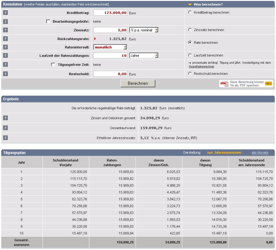 Ich gehe mal davon aus, dass Du einen Kredit in Höhe von 125.000 EUR hast (8% = 10.000). Hast Du Dir schon mal ausgerechnet was Du über die Laufzeit von 10 Jahren da an Zinsen zurückzahlen müsstest??? Hier kannst Du es mal nachrechnen. Wenn ich von einen Annuitätendarlehen zu 5% p.a. Nominal ausgehe mit vollständiger Tilgung nach zehn Jahren (das ist für Dich noch die günstigste Variante da so die Kreditschuld am schnellsten schrumpft und damit die Zinslast) dann zahlst Du wenn Du den Vertrag weiterlaufen lassen würdest 34.000 EUR an die Bank (siehe Anhang).