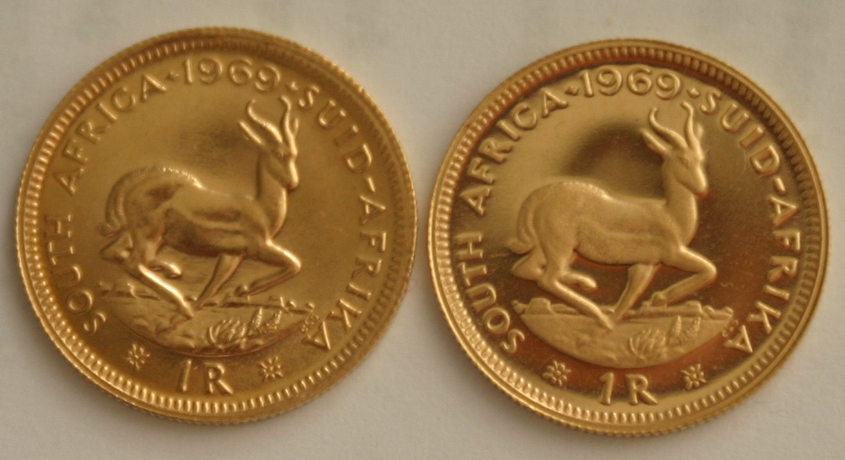 Es handelt sich um zwei 1Rand-Münzen : 1) 1 Rand von 1967 in Stempelglanz + 2) 1 Rand in prooflike ? von 1961. Nebeneinander für den Vergleich - leider kann man nicht so gut den Unterschied erkennen - vor allem die gelbliche Farbe des Rand von 1961 - im Vergleich zu dem etwas rötlichen Schimmer des Rands von 1967 !!