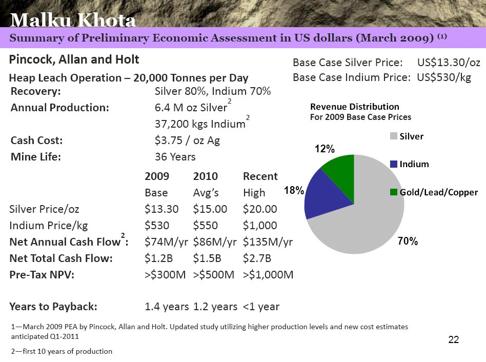 Nach eigener Angabe mit den 10.größten Indiumvorkommen der Welt, aber besonders bemerkenwert hohe Silbereserven.