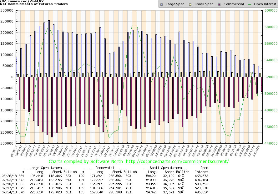 Beim Tief Ende 2016 bei 1.123 $, stand sie mit 117.612 Kontrakten wesentlich höher als aktuell mit 65.668 Kontrakten bei 1.211 $. (bzw. ca. 1.224 $ am 24.07.2018) Das ist ebenfalls als positiv zu werten!