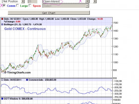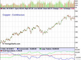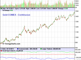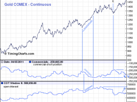 The chart below from timingcharts.com shows the price, commercial short position and open interest.