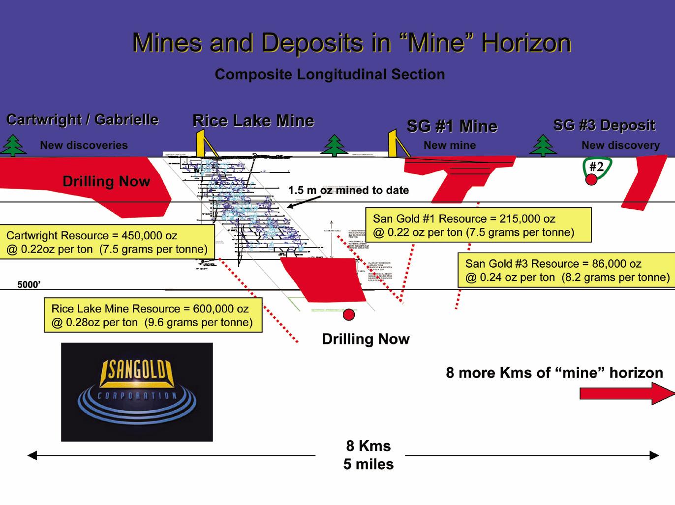 San Gold Corporation is a Canadian mining company focused on gold exploration and mining in the Rice Lake Greenstone Belt in SE Manitoba, Canada. The Company’s Rice Lake Gold Project includes two mines, the deep underground, high-grade Rice Lake mine and the nearby near-surface ramp accessed San Gold #1 (SG-1) deposit. A third nearby deposit, the recently discovered Cartwright gold deposit is slated for near surface ramp development in 2007. The Rice Lake Mine officially opened on August 23, 2006. Steady-state production according to mine plan specifications, from both the Rice Lake and SG-1 mines, feeding the centrally located 1250 ton per day mill at Bissett, is expected to be achieved during 2007. The mines are expected to provide the cash flow and a sound foundation for growth of the Company through exploration and acquisition.