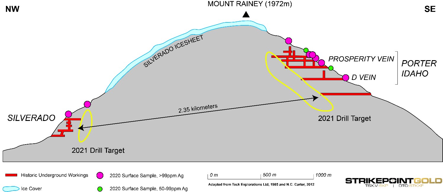 Shawn Khunkhun, CEO von StrikePoint, erklärt: "Unsere Explorationsarbeiten auf dem Grundstück Porter schreiten weiter voran und verbinden die historischen hochgradigen, direkt verfrachteten, ehemals produzierenden Minen bei Prosperity/Porter Idaho auf der Ostseite von Mount Rainey mit den Silverado-Minen auf der Westseite, die über zwei Kilometer entfernt liegen. Wir haben es hier eindeutig mit einem hochgradigen Silberader-System zu tun, das sich in Sichtweite der Bergbaustadt Stewart, BC, befindet. Mit einer starken Schatzkammer freuen wir uns auf ein aggressives Bohrprogramm im Jahr 2021 mit dem Ziel, diese beiden berühmten Betriebe miteinander zu verbinden. Darüber hinaus werden die Ergebnisse unseres Bohrprogramms 2020 auf dem hochgradigen Gold-Silber-Grundstück Willoughby in Kürze veröffentlicht werden."