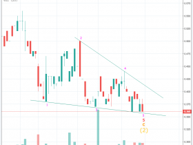 Kreuzunterstützung bei 0,35 C$, a=c Szenario bei 0,38 C$, kleines EDT in einer untergeordneten Ebene der Welle 5 von c bei 0,35 - 0,36 C$ und ein kleines offenes Gap aus dem Sommer 2016 bei 0,36 C$, welches gestern geschlossen wurde. Das 76,4 % Retracement liegt bei 0,346 C$.