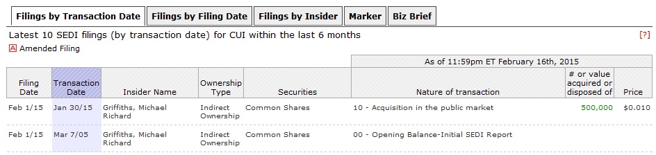 Feb 1/15 Jan 30/15 Griffiths, Michael Richard Indirect Ownership Common Shares 10 - Acquisition in the public market 500,000 $0.010