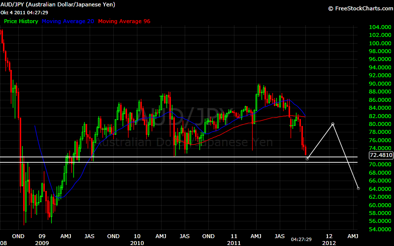 Beim AUD/JPY könnte bereits jetzt bei 72 oder 70.5 ein Boden gefunden werden, was nicht viel Downside-Potential ergibt. Zudem besteht die Gefahr einer intervention seitens der BOJ.
